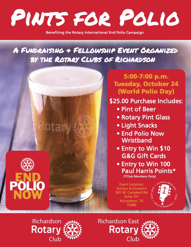 Once a year, on World Polio Day, we along with our sister Richardson Rotary Club, sponsor Pints for Polio at a local restaurant or bar. The donations collected on that day are also destined for the Polio Plus cause.